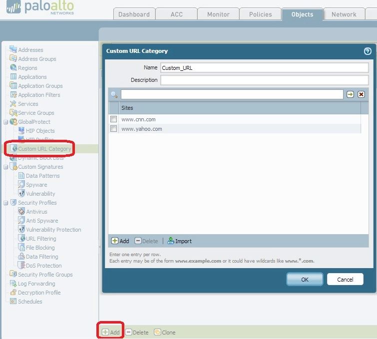 1. 对于PAN-OS 4.15.0,进入Objects > Custom URL Category并点击Add