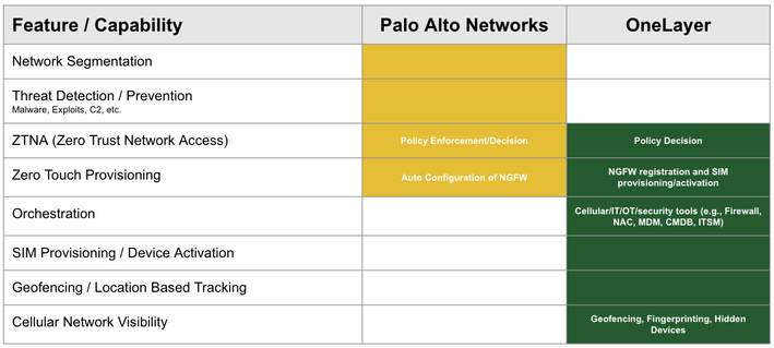 In order to help provide clarity around how our partnership works and which vendor brings which capability, we have made the table below that attempts to break this down. This table focuses on feature ownership for this solution, and is not a comprehensive list of vendor features. For instance, Palo Alto Networks can also offer Device Fingerprinting, but OneLayer is providing that functionality in this joint solution.