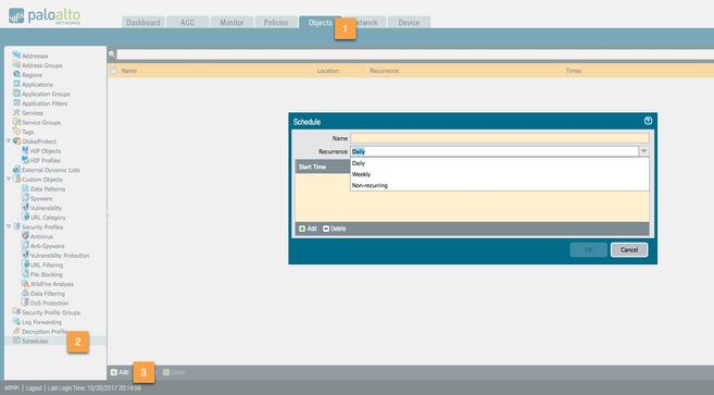 To do so, you will need to add schedules to your rules. Adding a schedule is as easy as pie! Simply log into your firewall GUI and browse to Objects > Schedules.
