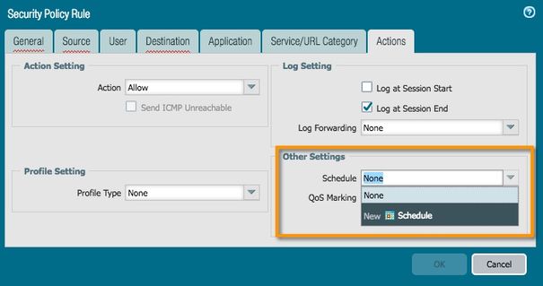 Alternatively, you can create your policy rule first and on your rule's Actions tab, you can also create a new schedule. Either method works fine.
