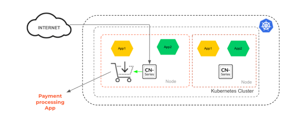 To stop the lateral movement of threats between different applications running on the same Kubernetes cluster as well as to comply with regulatory standards such as HIPAA and PCI, large healthcare providers and online retailers have inserted CN-series between Web-server application facing the internet and the Database application holding the sensitive data. By doing so, the customers can ensure threats don’t move laterally between different applications and hence, comply with regulatory standards.