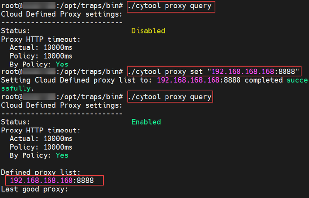 Below, you can see how to query the proxy settings using ./cytool, setting a new proxy ipaddress:port and confirming that the settings are configured properly.