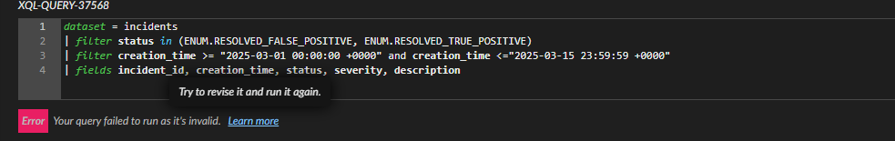 Although I have defined the timeframe, this query does not filter incidents created only within that timeframe. It includes incidents that may have been created outside the timeframe but were updated during the timeframe.