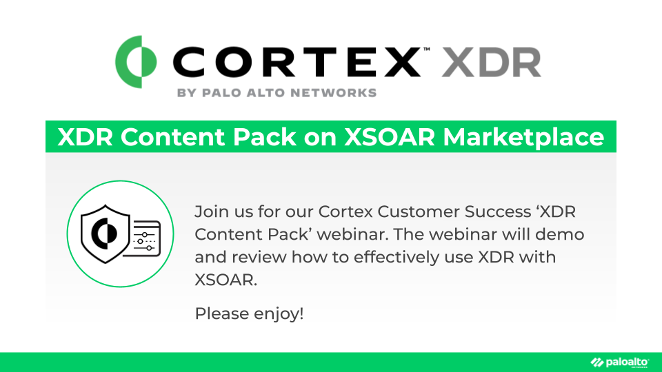 In this Cortex Customer Success webinar, our Security Experts showcase how to intertwine our Cortex products. This episode covers the XDR content pack on XSOAR marketplace and how to effectively use XDR with XSOAR.