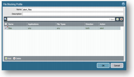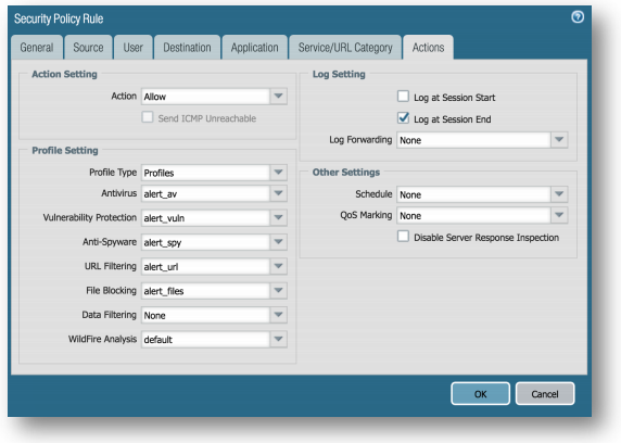 When it comes to security profile Action settings, Alert = let it happen but log it, Allow = let it happen don’t even log it, and all other actions are some form of block. Drop, reset-both, block-ip, and others are all examples of a blocking setting. At a minimum, all configs should use Alert – but best practice is to block threats, not just log them. The following is a sample baseline configuration that would provide blocking and logging of threats and URL activity.