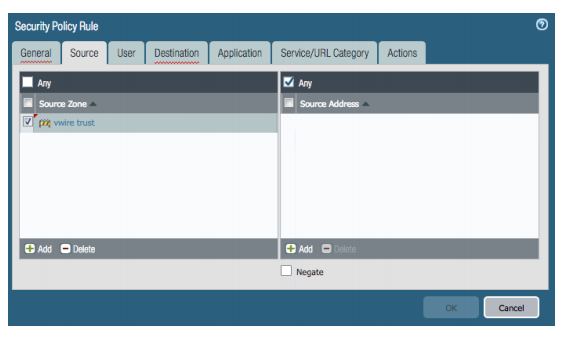 - Source Tab, Select Vwire trust for Source Zone and Any for Source Address