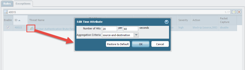 Click the pencil icon next to the name, and you can modify the values. Number of hits is between 1 and 255, per 1 and 3600 seconds.