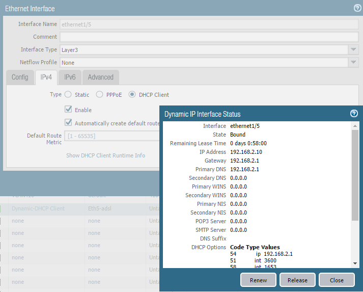 i've connected a adsl modem to our 3020 to redirect some clients to, configured the interface as dhcp client, the port successfully gets an ip address from the modem but i can not ping the modem interface from firewall's cli. I might be missing a simple step but i'm fairly new with PA, any help appreciated, thank you