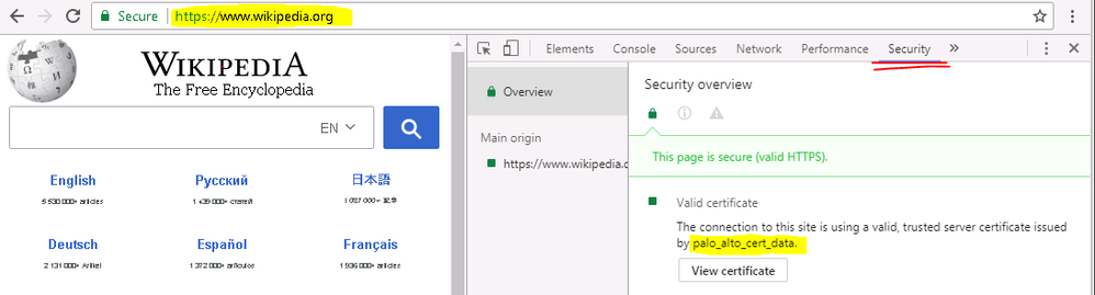 At this point, I expect every https request of any website to be not inspected. Meaning, now if I open up my Chrome and go to (lets say) https://www.wikipedia.org/ and check the Security Overview (F12 -> Security) - I should see the 'real' Certificate of this website. Same result should apply to the alternative of using openssl command for requesting https websites instead of just browing via Browser Software like Chrome. (openssl s_client -connect wikipedia.org:443)