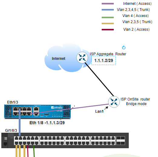 I m setting up a small office network where the endpoints are connecting to a switch that is in turn trunked to a PA220 Firewall . The firewall external interface is configured with a static IP address within the same range as the ISP IP router .
