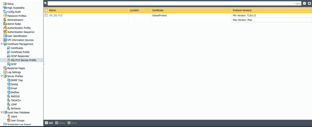 1. Go to device > Certificate mgt > ssl/tls service profile > add. It should look like the image (2) below when you are done.