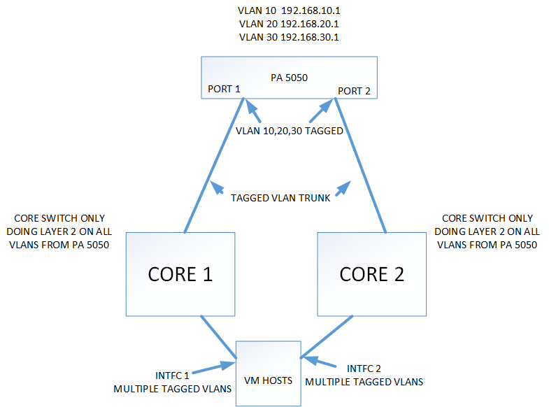 Hope that helps to show what we are trying to accomplish. We want the vlan traffic examined by the PA 5050 before it reaches the servers. Right now some of the vlans are routed by the cores and now passed through the PA 5050.