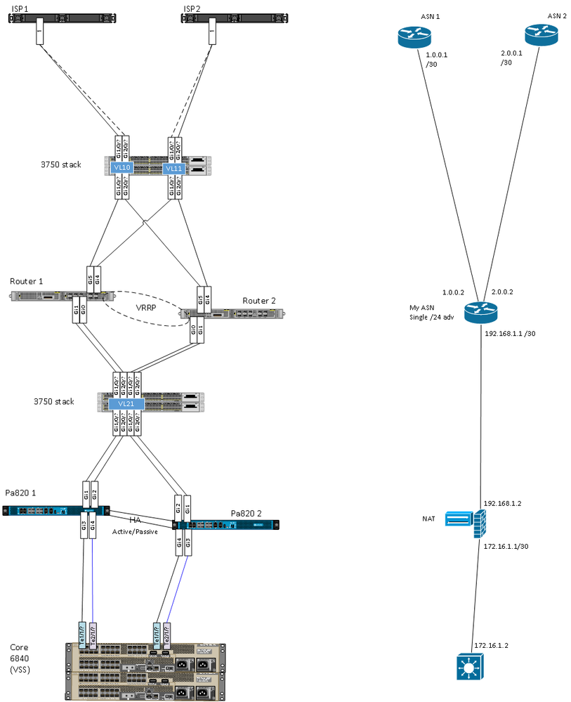 Some said it would be much simpler if I just ran each ISP through one router direct to one port and let PA do the BGP, but to me that still doesnt solve redundancy on the trunk links to the core - would be nice to just use Port channels, guess it could just be by secondary route interface (was thinking RSTP probably not a good plan).