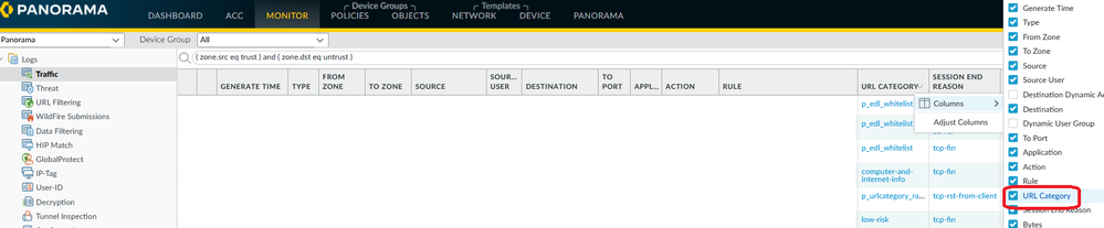 the only URL related logs that show up in Traffic logs is "URL Category". That field is not showing up by default. You will have to add it: