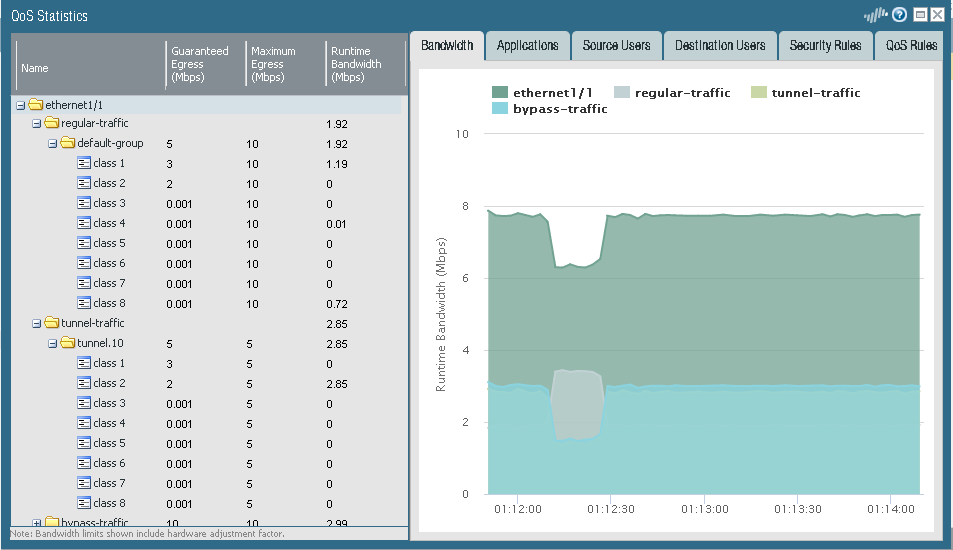 In order to configure this structure of QoS I needed to set the interface bandwidth (egress max) to 10 so that I can allocate my desired gaurenteed bandwidth values. There were no errors after configuration & the values do show accordingly in all menu's how ever when I test I notice that the firewall is not strictly enforcing the gaurenteed bandwidth that I have configured for each class. I see that all 3 QoSpolicies are getting hit & in the QoS interface statistics I see the test traffic crossing the right class. Am I missing something? This seems like an easy configuration to make but the palo is just not strictly enforcing the configuration of the QoS profile & policy. See the statistics in the pic...