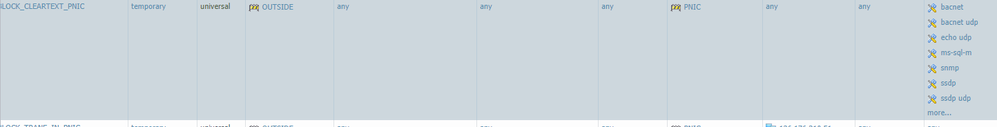 Essentially what this rule would be doing is specifying that traffic from OUTSIDE can't access anything within PNIC on any service object specified in the security policy. Since the Service object is essentially a port, all this rule is doing is denying OUTSIDE from accessing PNIC on any of the ports that the Service objects actually refer to. Someone likely did this so that they could generate traffic logs for outside traffic on these specific ports, but still keep the default interzone traffic rule logging disabled.
