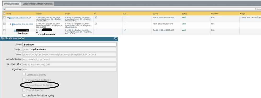 We have a certificate generated by RapidSSL as CA. but we can NOT set this certificate as a forward trust certificate to use in Decyption SSL, the option shows disable. Roots is in the list "default trsuted certificate authorities".