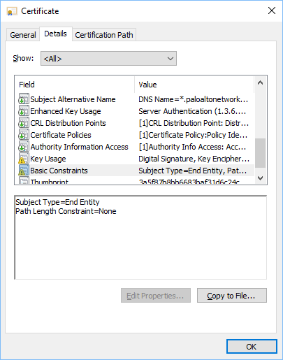This is Palo Alto's wildcard certificate, signed by DigiCert. So let's look at the CA Certificate, and then inspect the Basic Constraints: