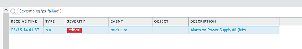 I do not have exact same Firewall to test it, however I did some testing with a Firewall in my lab. If you are after alert for power failure, then you can get it from System logs by using this filter: ( eventid eq ps-inserted ) or ( eventid eq ps-removed )