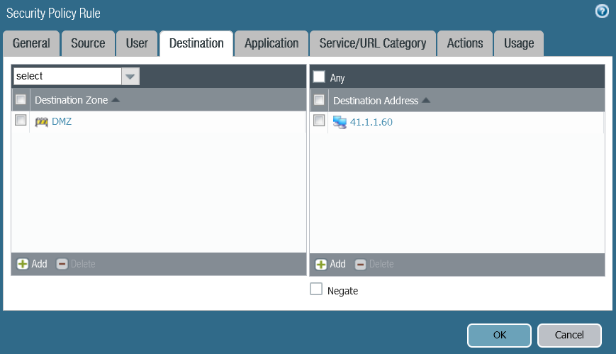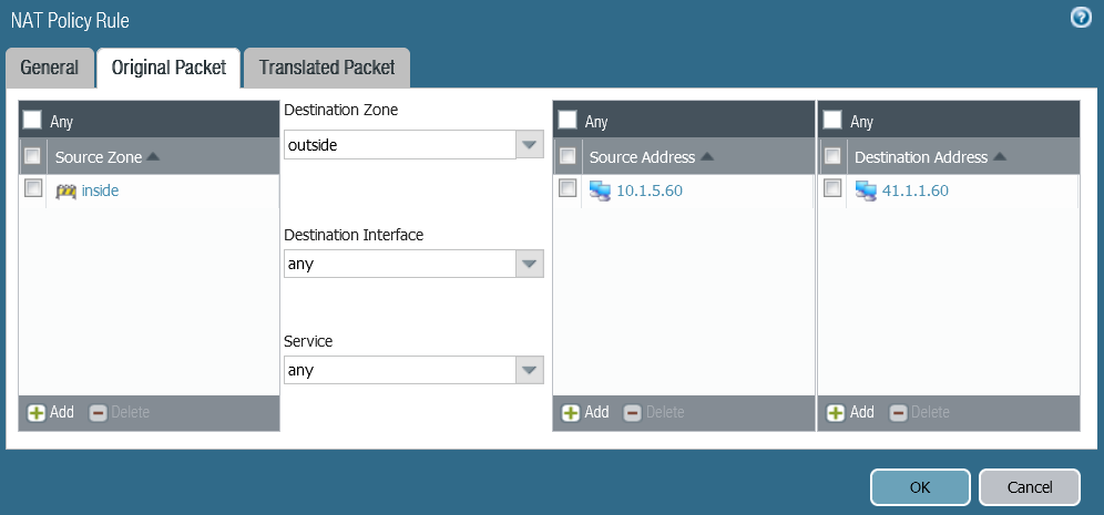 A static one-to-one NAT must be configured, which performs the NAT of the public IP address 41.1.1.60 to the LAN IP address 10.1.6.60 of the Cisco Expressway-Edge. Below a Destination NAT Rule that translate the Public IP 41.1.1.60 to the Private IP 10.1.6.60.