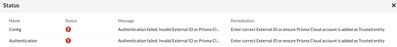 Cloud account cannot be monitored due to missing permissions. Hit the Review button to see the current status and update settings. Error: Unable to ingest data from one or more services.