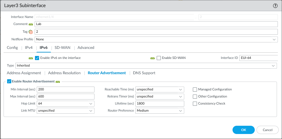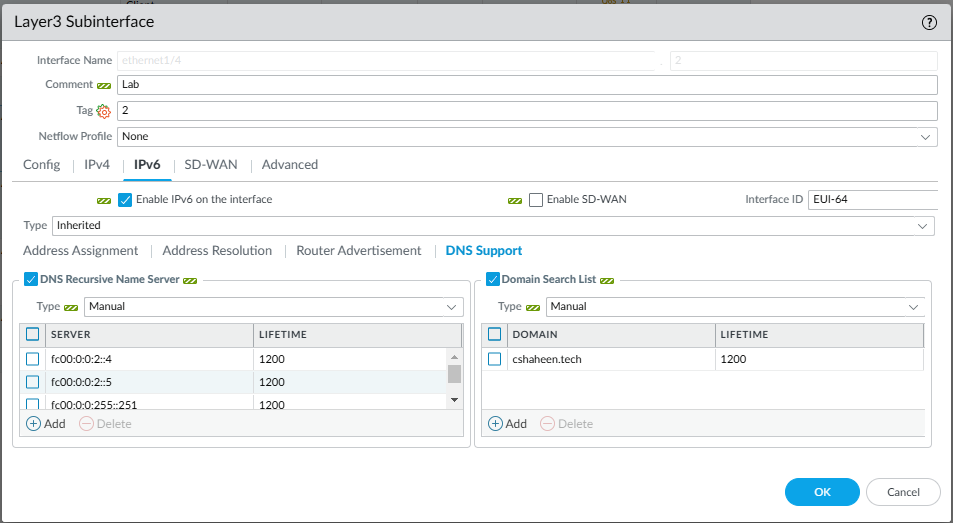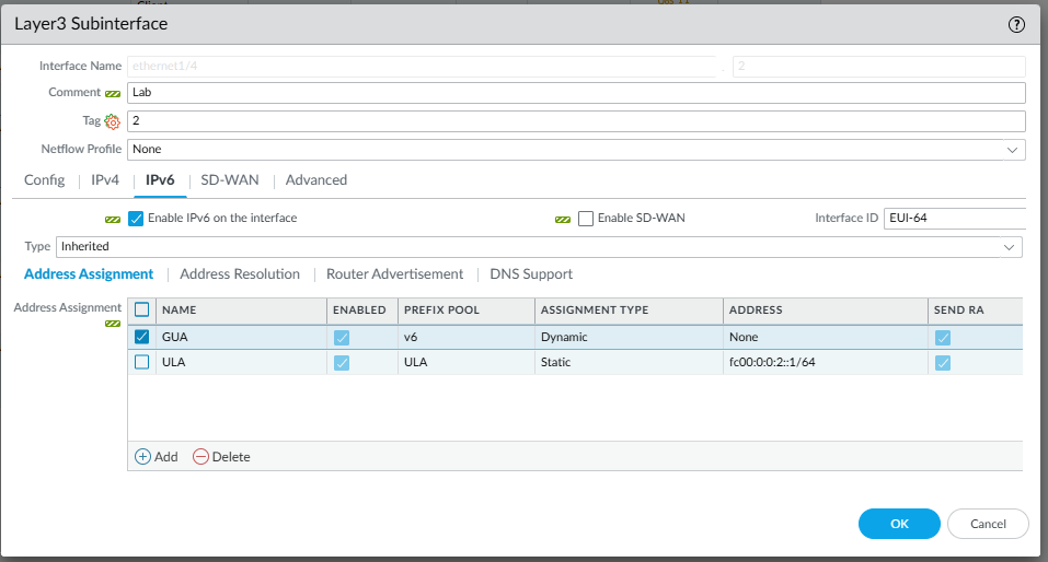 Hello! I have a Panorama running 11.2.2-h1 managing an A/P HA pair of VM firewalls running 11.1.6-h3. I'm trying to configure the firewalls' interfaces to configured their IPv6 addresses based on a prefix delegated by the ISP on the WAN + a ULA address. I'm running into the below commit validation error on the Panorama (not even making it to the firewall). I've attached some SS of my config. What am I doing wrong here? What can I do to troubleshoot? I've already tried disabling everything on the sub-interface (DPD, NDP monitoring, RAs, DNS, IPv6 entirely) one at a time without any luck. I also tried disabling LLDP on the parent interface
